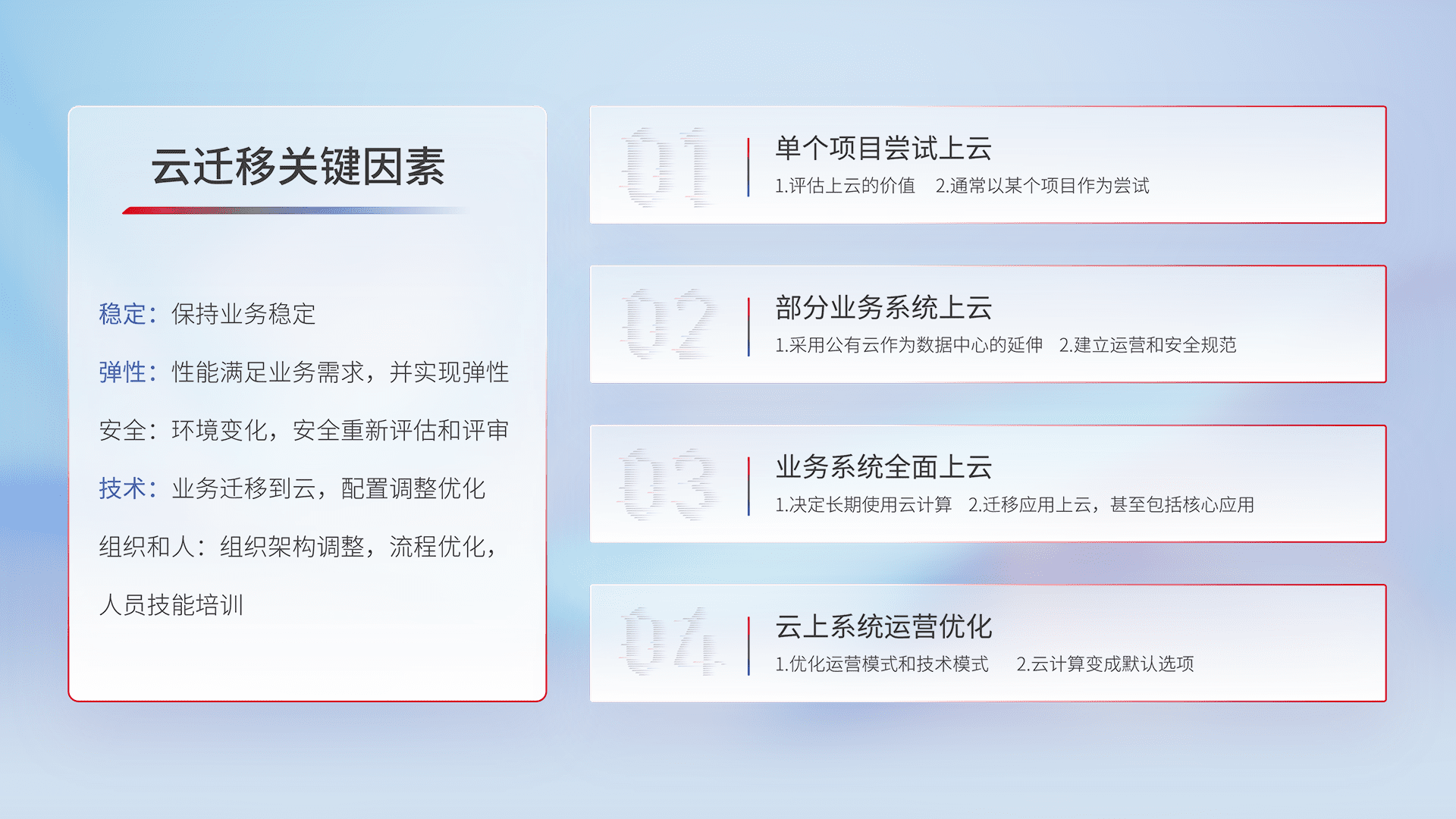 结合实际业务,,从规划设计、、云平台选型、、、、云原生改造、、数据迁移、、集成交付,,,迁移全过程为客户识别最佳上云路径,,,做好风险识别管理,,设计网络架构、、、身份权限、、安全审计合规、、、操作审计、、、日志审计、、、、监控告警策略、、多站点容灾设计等,,,对云上基础设施进行整体规划,,,提升IT治理水平,,以满足弹性、、、、高可用、、高性能的需求。。。。